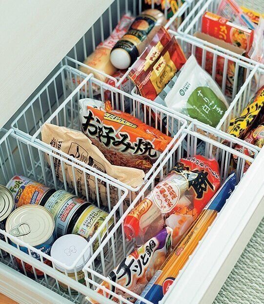 深い引き出しにはワイヤーかごを入れて空間を仕切るのが◎。物は重ねず、コンビニのアイスケースのように商品ラベルを目立たせて立てる。