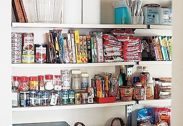 ストックは全て立てて、商品名が読めるように配置。調味料類はひな壇式に後ろの列を高くして、後方にある調味料も全て見えるように収納。