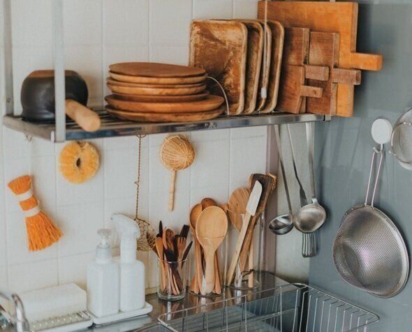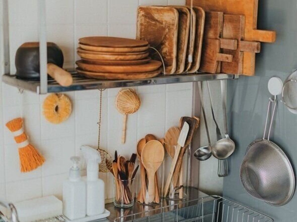 ツールは木などの自然素材の物を選ぶと、インテリアに溶け込むので、出しっ放しにしてもOK。シンク周りに集結させると、出し入れのストレスも激減。