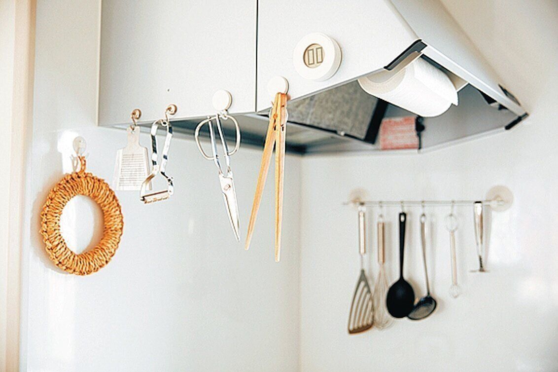 超1軍のキッチンツールだけを厳選し、マグネットやフックでつるして「浮かす」と、調理中にさくっと取れて便利。「マグネットやフックは100円ショップや無印良品の物を活用しています」。