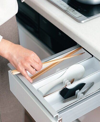 よく使う物は右手の真横に"置く"感覚で収納。「奥行きのある引き出しは手前にポールを渡して、バットやボウルを立ててしまうと、少し開けるだけで取れます」。