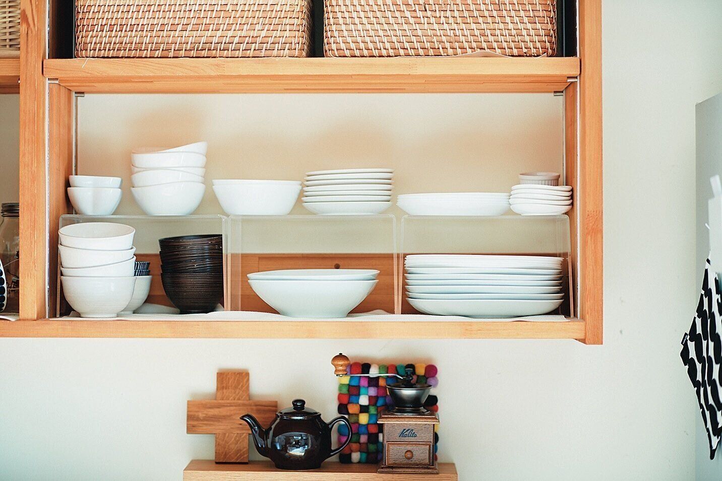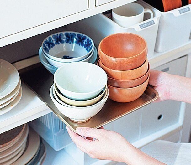 グラスはトレーの上、お茶碗は半透明ケースの中など、種類別に定位置を決めるとアイテムが混在せず、無意識に戻せる。取りたいお皿もスムーズに出せる。