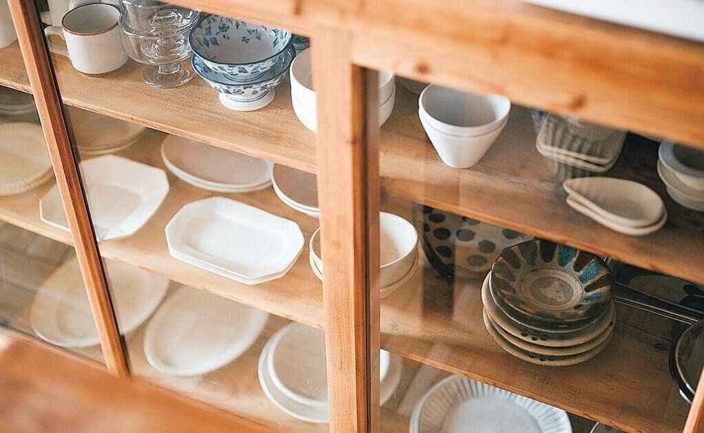 奥行きがあって高さがない食器棚にお皿をしまうときは、前後できっちりお皿を並べるのではなく、あえてジグザグに隙間を作って配置。このひと手間でグンと取り出しやすくなる!