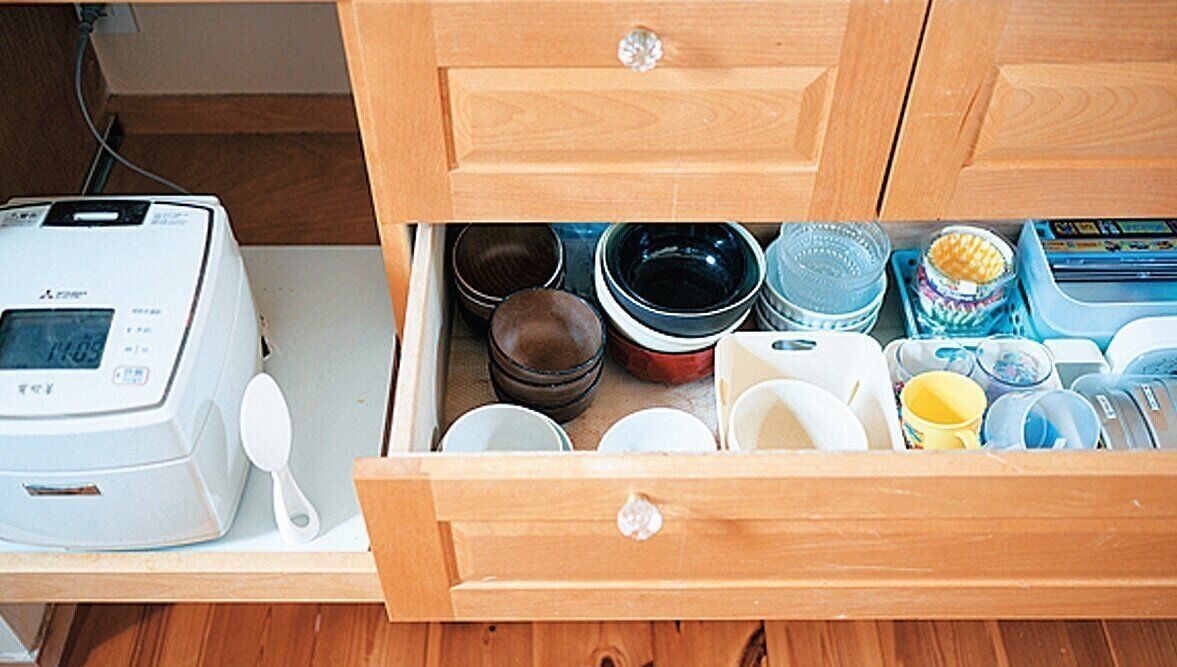 子どもの茶碗は炊飯器のすぐ横に配置すると、子ども自身でごはんをよそえるように。飲み物もセルフで飲めるようコップも同じ引き出しに配置。低い位置に置くのもポイント。