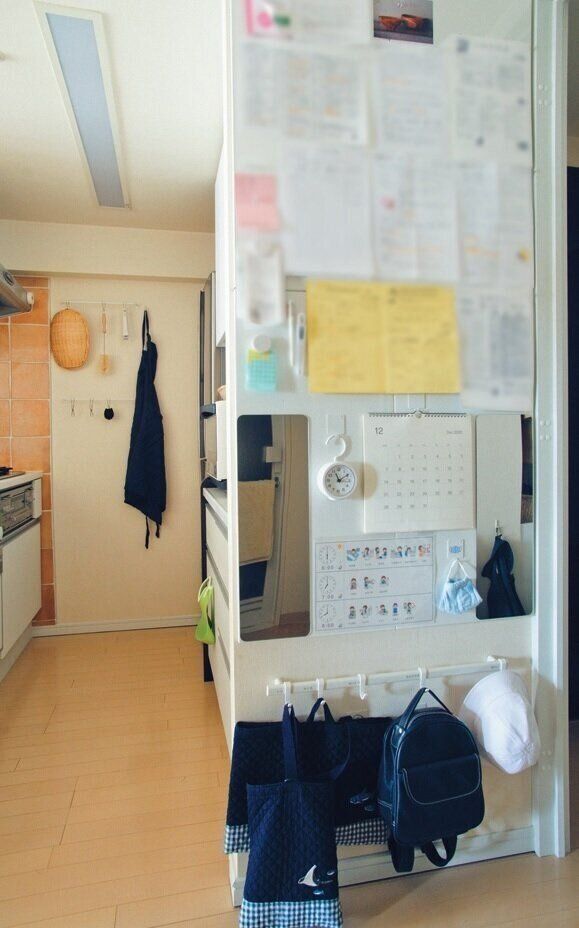 玄関とリビングをつなぐ廊下の壁に、フックを設置。子どもの目線の高さに通園セットを掛けたら、用意がスムーズに。