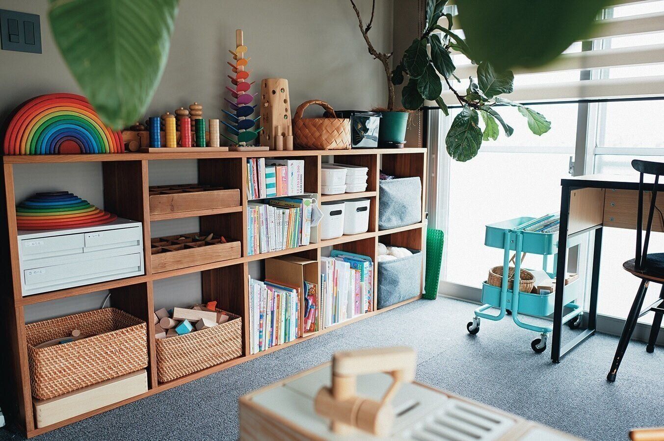 並べておけば無駄に引っぱり出さなくなり、おもちゃをまんべんなく使えるように。遊ぶ場所付近に置き場を作れば、他の場所に持ち出して散乱することもなし。