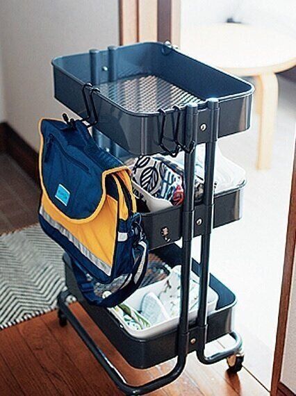 玄関にワゴンを置き、上段をランドセル置き場、後付けしたフックに習い事バッグを。邪魔なときは、子ども部屋に移動も簡単。