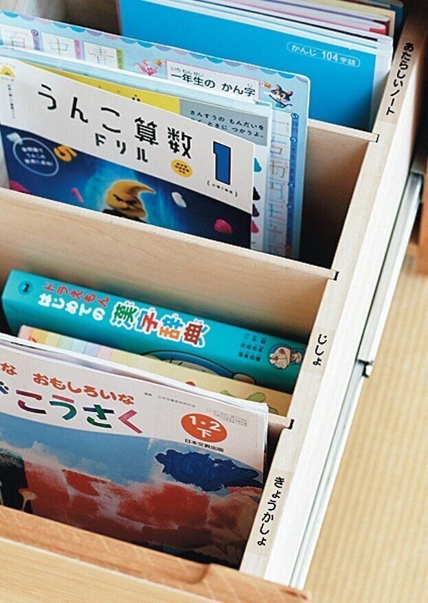 学習机の引き出し内にラベルを貼り、戻す場所を決めておくと準備がスムーズ。教科書、辞書など、ざっくりジャンルごとに分ければOK。
