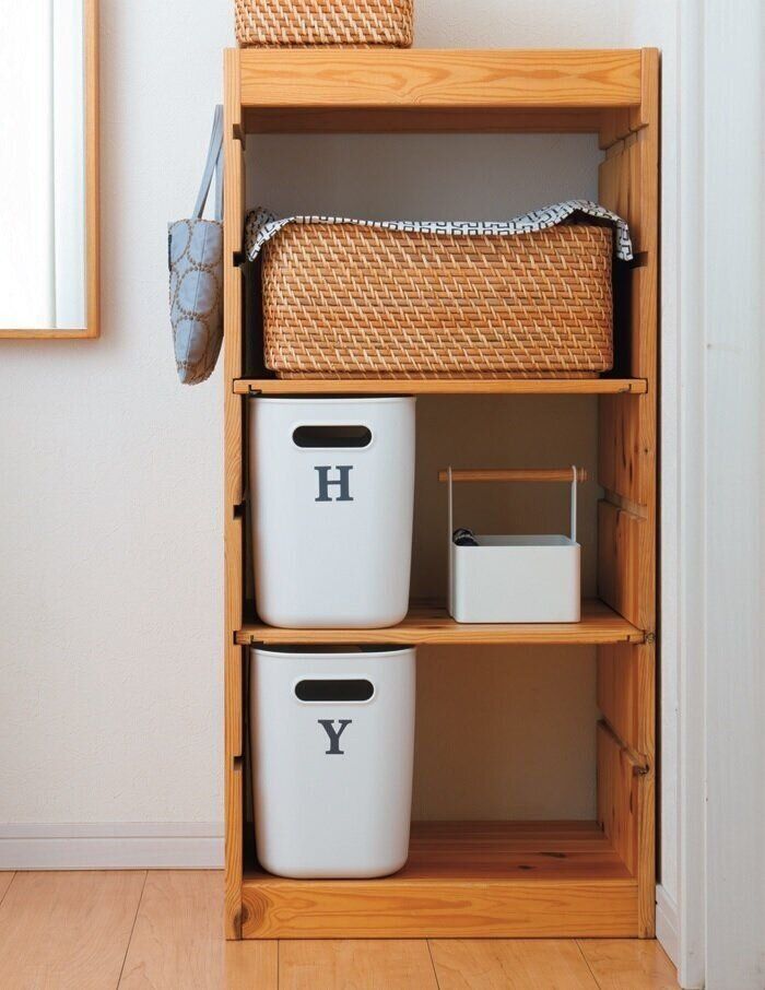 玄関に置き場を作れば、リビングに持ち込まれることもなし。棚に人別の専用ボックスを置き、管理は本人任せに。身支度アイテムを入れておけば、外出時に部屋まで取りに戻る必要もなく、準備もスムーズ!
