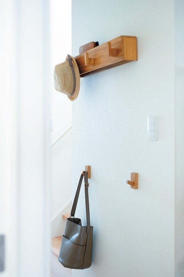 玄関横の壁を有効活用。フックを取り付ければ、帽子やバッグなどのかさばる物がさっと掛けられて、玄関がすっきり。