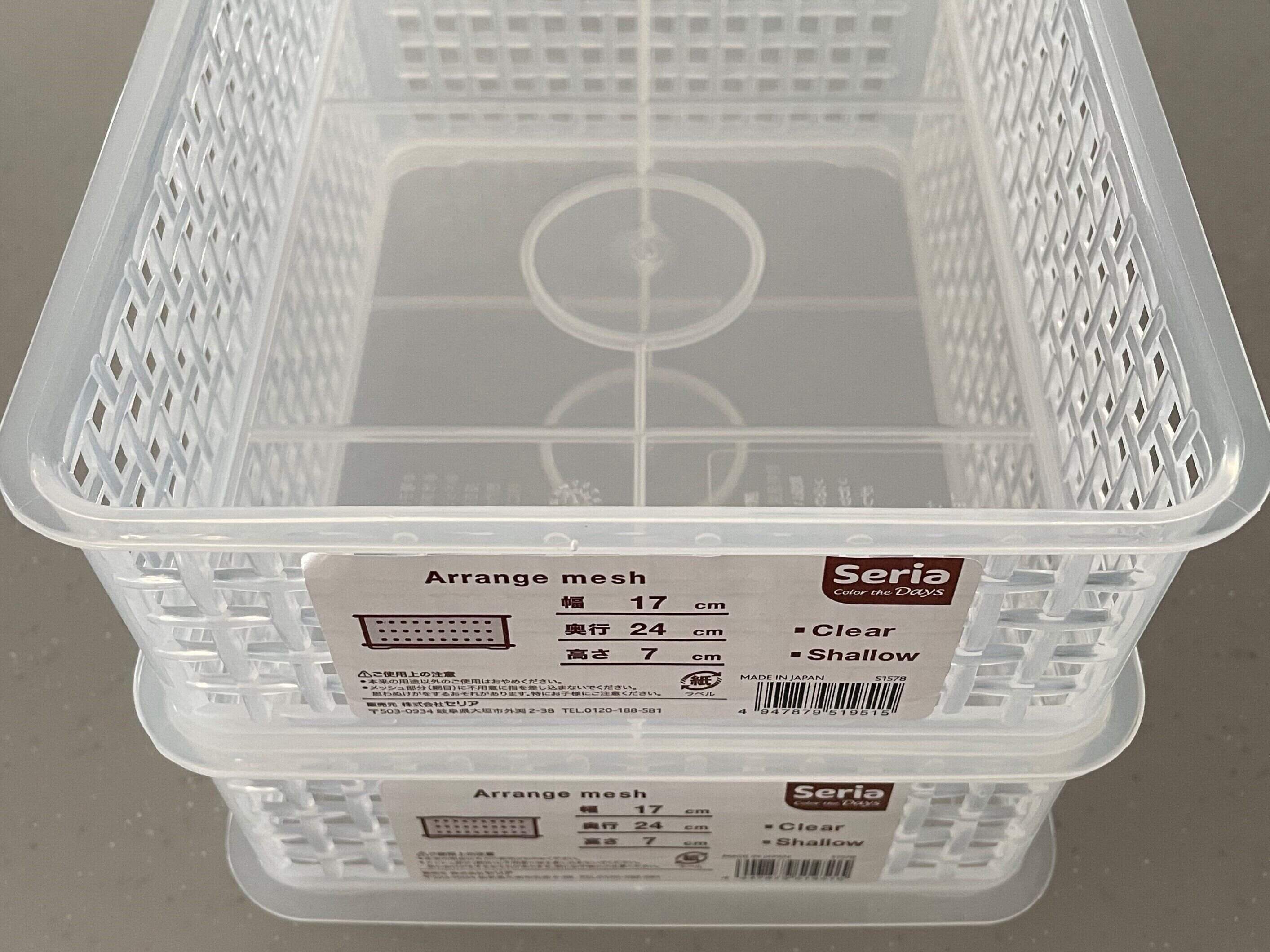 浅型なので冷蔵庫のタテ空間を有効に使いたいときに便利な、セリアの「アレンジメッシュ浅型(クリア色)」(幅17 ×奥行24×高さ7cm)。