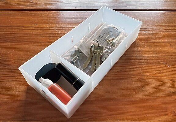 いざというときにすぐ見つけられるように、家、自転車、引き出し、スーツケースなど、鍵類はまとめて収納を。その際、袋分けしたりシールを貼るなどして、家族もどこの鍵か分かるようにしておくと◎。いずれも貴重品ボックスに。