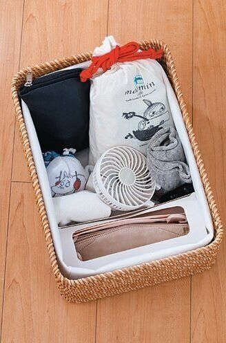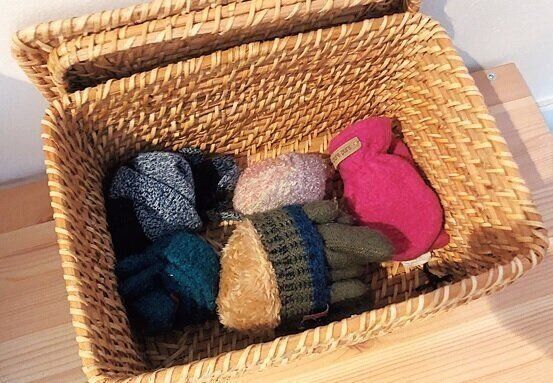 手袋や帽子、マフラーなどの冬小物類は、リビングに持ち込んだらアウト!行方不明になりがちなので、玄関に置き場を作るのが正解。かごを置き、投げ込み式にすれば子どももOK。シーズンオフには、コートと一緒に収納を。