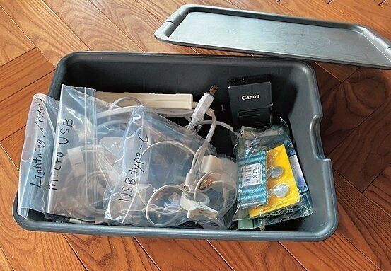 よく使用する携帯の充電器は、コードに差したままにするか、充電場所の近くにかごを設置すればOK。その他時々しか使わない充電器は、何用かわかるように記してひとまとめにしておくと旅行のときなども慌てない。