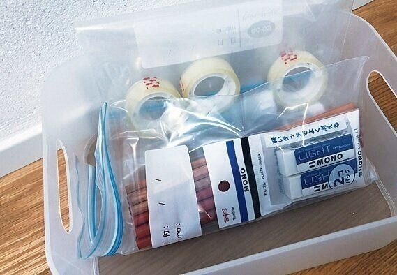 「書く物」「貼る物」「子どもの物」などざっくりジャンルごとに分けて、ジッパー式保存袋に。中身が見えるので、買い足す必要がある物が一目瞭然。数は最小限にして、引き出しや箱の隙間に入れておけばOK。