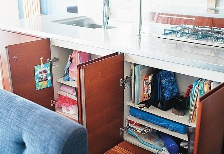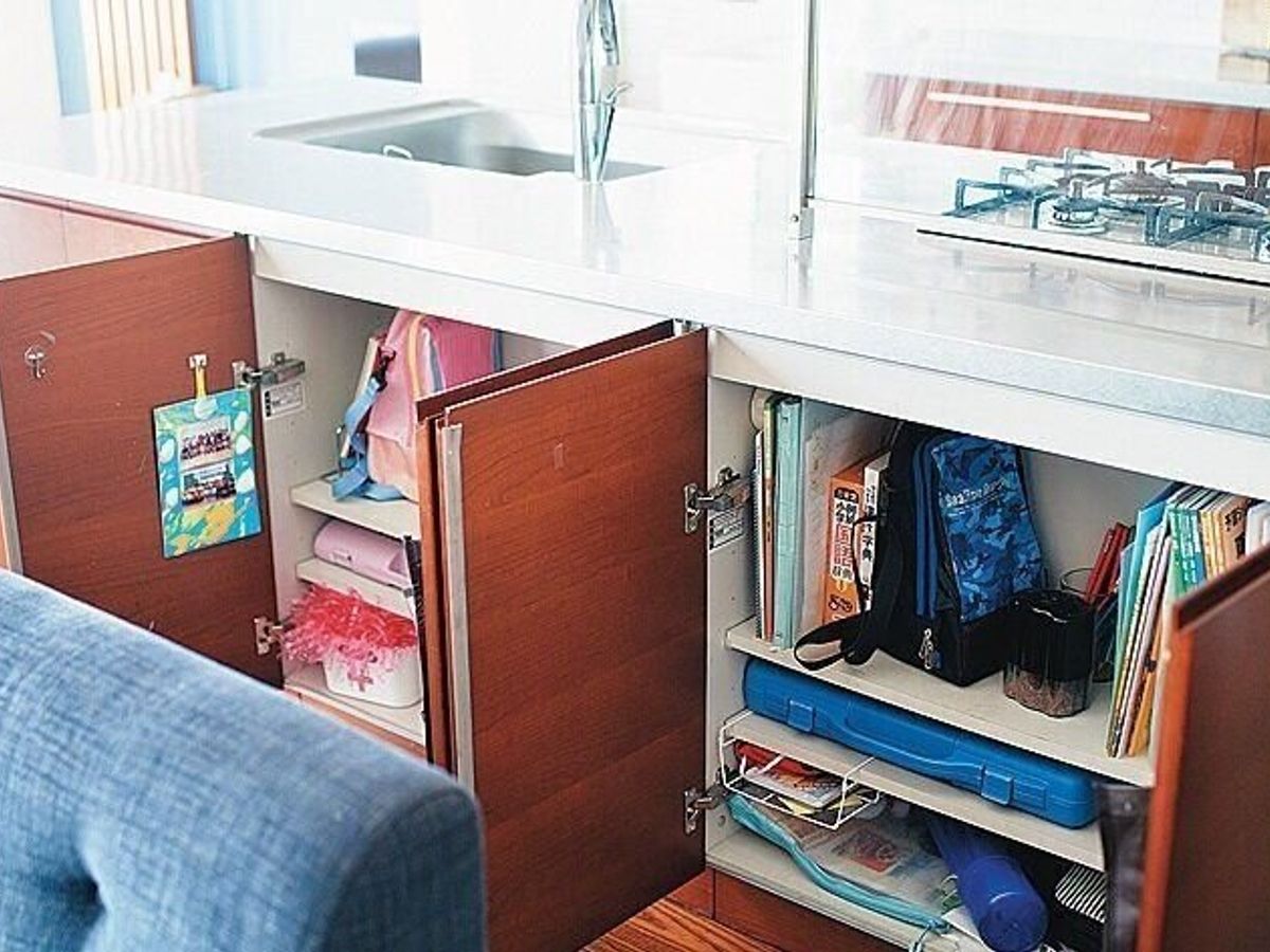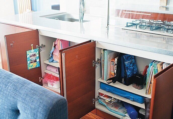 学校の荷物は、子どもたちが過ごす時間の長いダイニングに保管。ただし、「ここに入る分だけ」と決め、学期ごとに各自不用品をチェックして処分するので、物があふれずにパパッと片づけられます。
