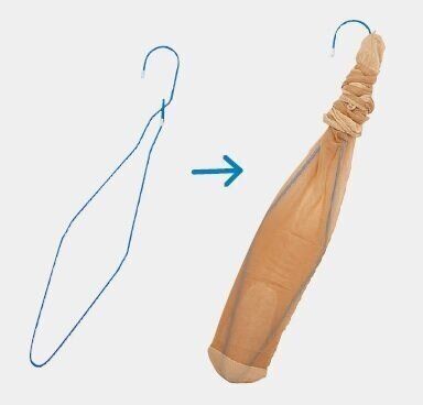 針金ハンガーを縦に伸ばし、古ストッキングをかぶせ、余った部分を巻きつけるだけ。ストッキングの静電気効果でほこりを吸着!