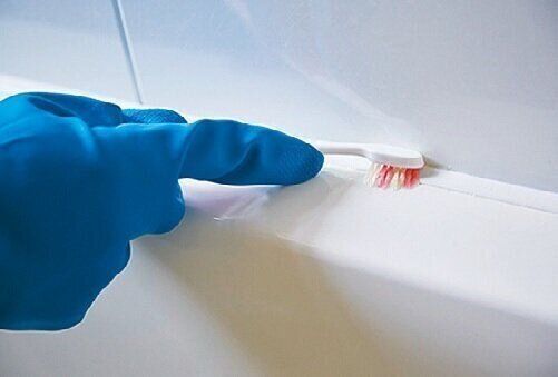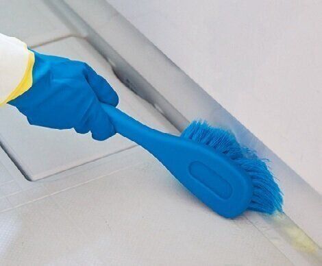 アルカリ電解水を含ませた古歯ブラシで、目地やつなぎ目、ドアパッキンなど、カビ取りする部分の汚れをかき出す。