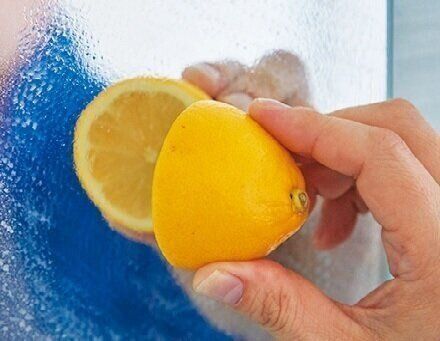 鏡に直接レモンの断面をつけ、回すように動かしながら、汚れ部分をこする。アルカリ性の水あか汚れには、酸性のレモン汁が有効。