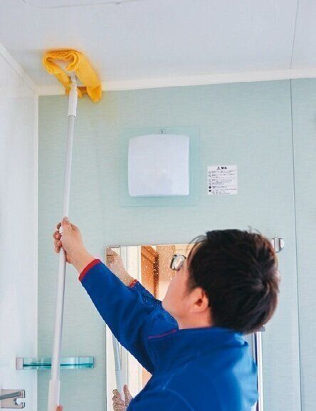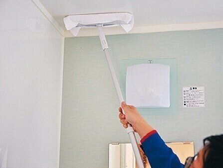 軽く湿らせたナイロンタオルにアルカリ電解水をスプレーする。フロアワイパーにセットし、天井を端からこするように拭く。