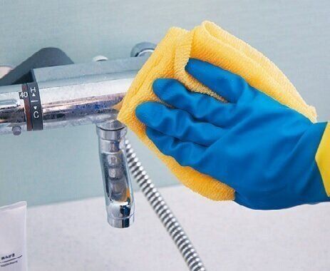 軽く湿らせたナイロンタオルに歯磨き粉をつけ、蛇口をこする。水で洗い流し、古タオルでから拭きする。ほど良い研磨力の歯磨き粉なら傷がつきにくい。
