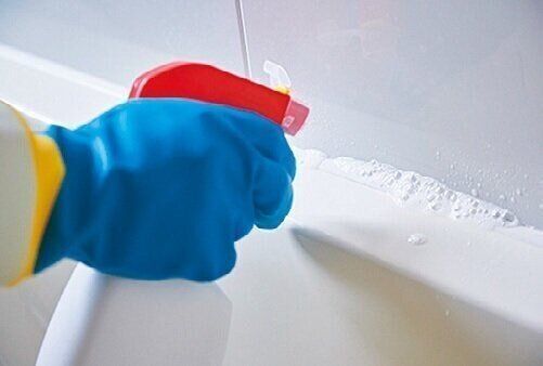 ゴム手袋やマスクを着用し、カビ部分にカビ取り剤をスプレーする。換気扇を回し、窓や扉を開けた状態で行う。