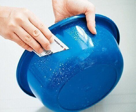 こびりついた汚れは斜めに切ったカードでこする。アルカリ電解水をスプレーし、ラップを貼って10分おいたら、スポンジでこすり、シャワーで洗い流す。