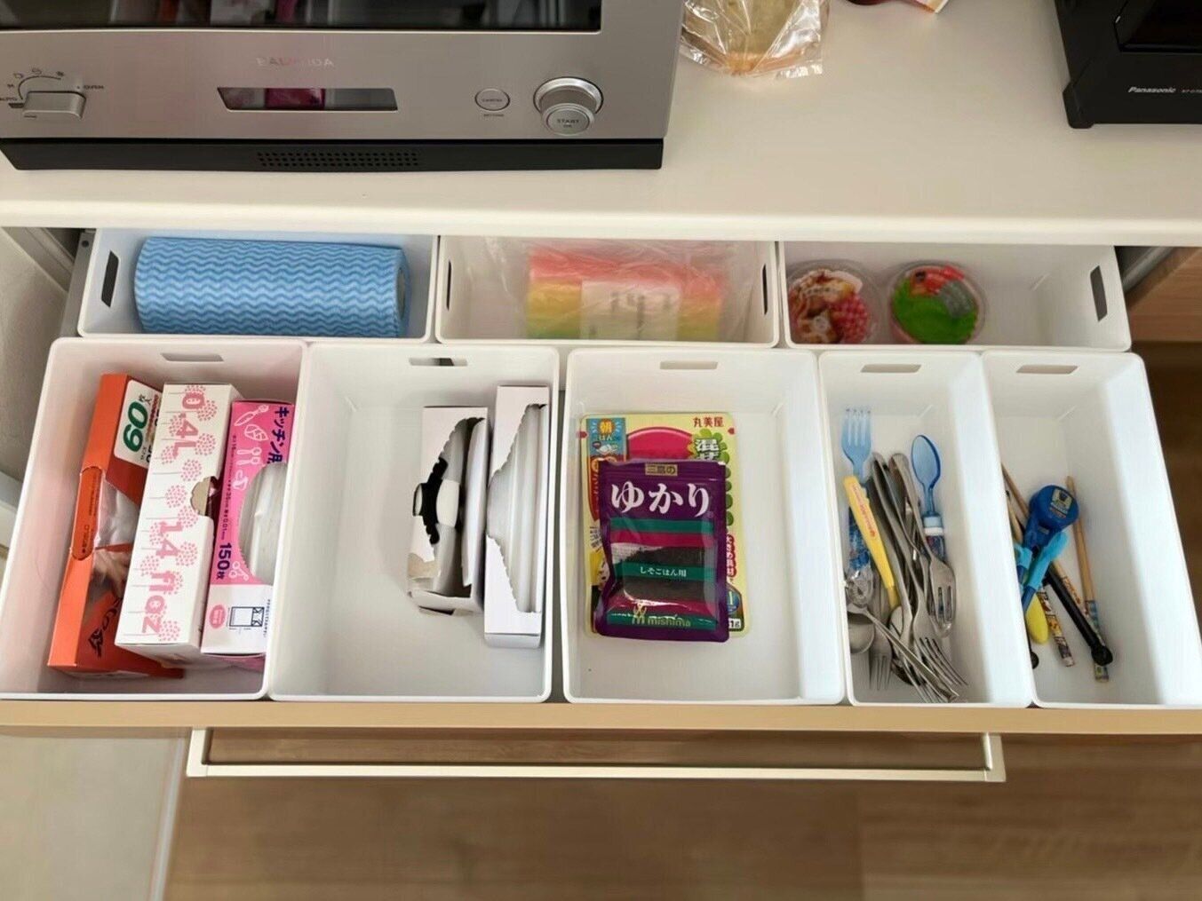 キッチンの引き出し収納でも、引き出し内のスペースに合わせてぴったりと使うことができます。