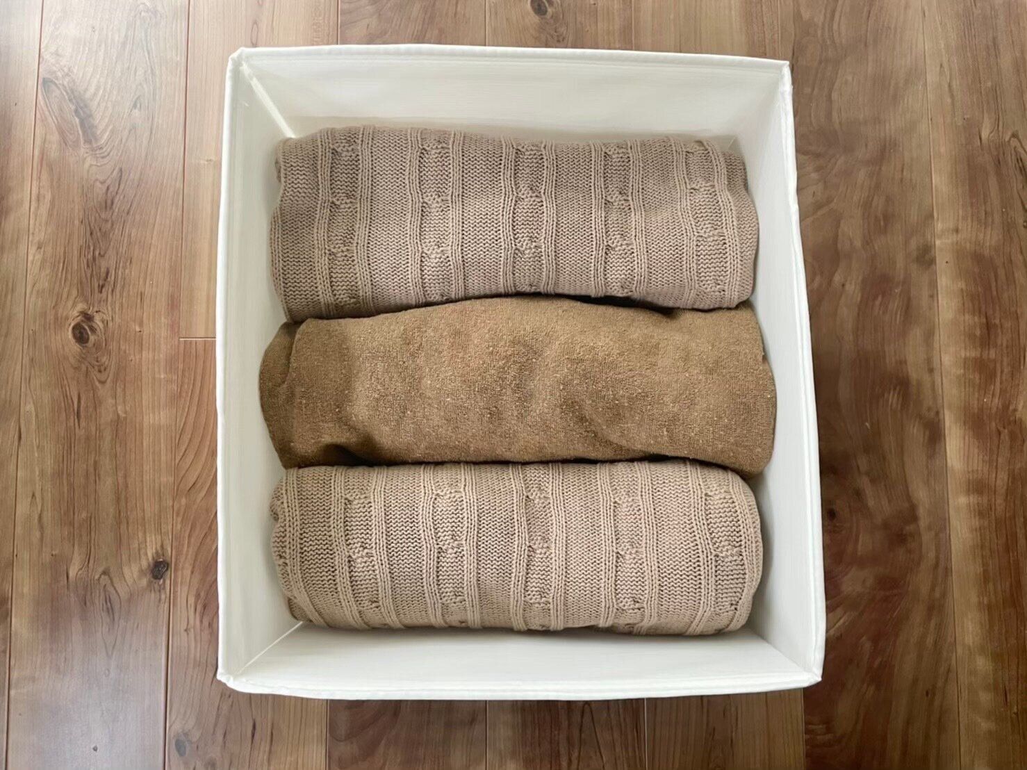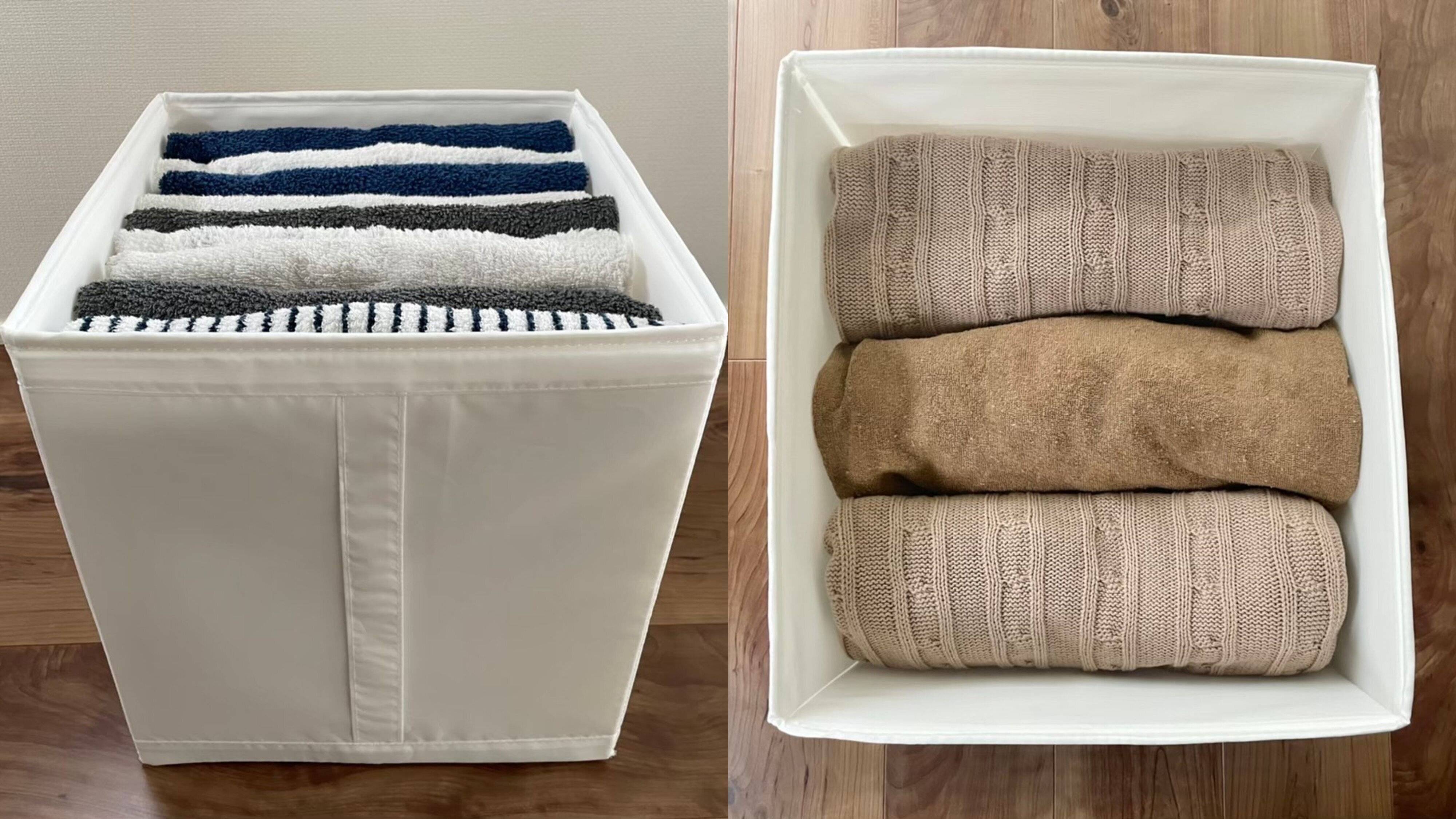 バスタオル、季節寝具やタオルケットなど、収納が必要な布製品もあります。IKEAの「SKUBB(スクッブ)」(幅31×奥行き34×高さ33cm)は表面がツルツルとしているので、セーターのように思わずひっかけてしまいがちな衣類の収納にもおすすめです。