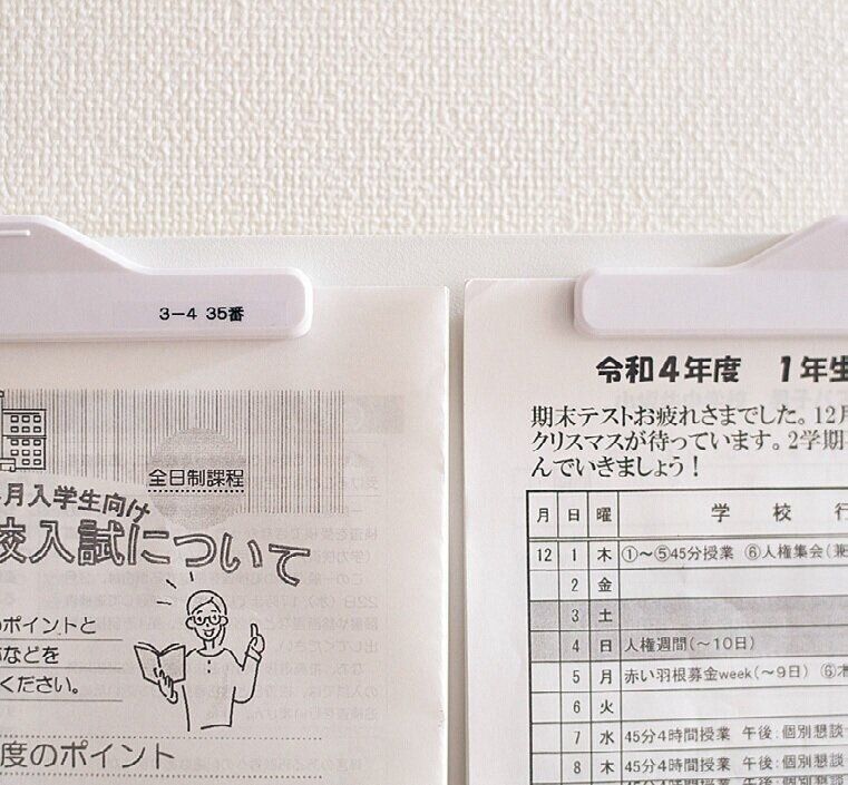 「出席番号まで覚えてられませんよ」ってことで、子どものお便りを挟むクリップには出席番号を印字したシールを貼って。