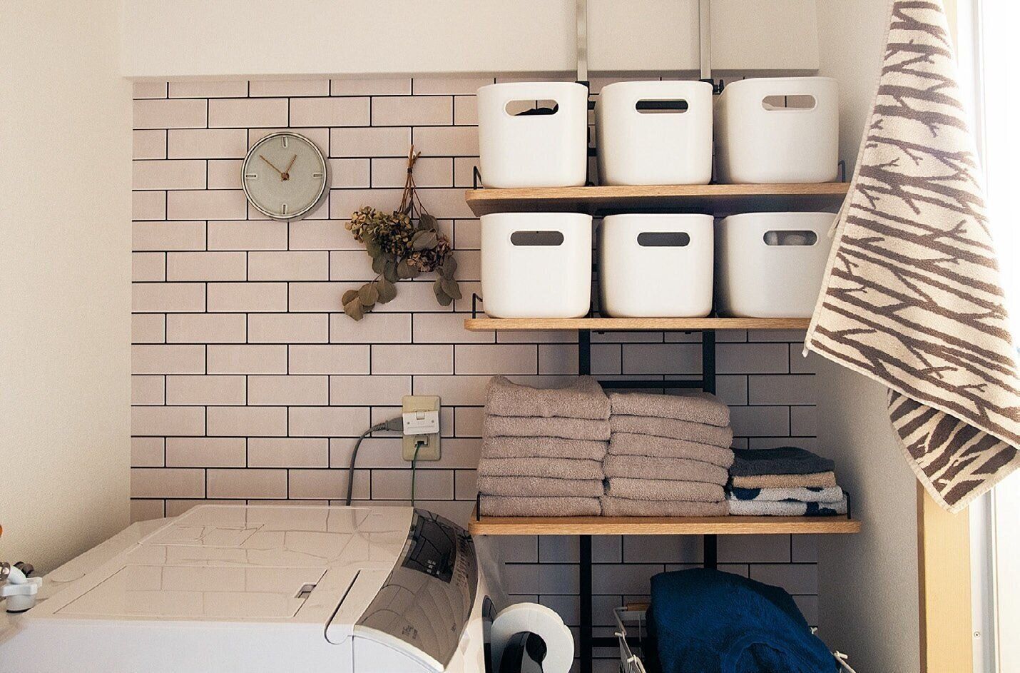 洗面所が狭いので置く物は極力少なく。でも下着はここにあると便利だから、1人1BOX制を導入し、インナーもパンツも1人各3枚に。乾燥後、放り込むだけの超ラク収納です。