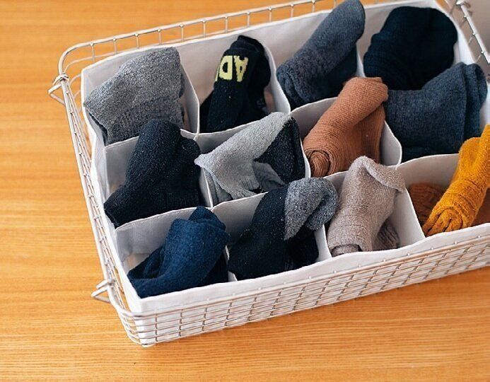 「前はもっとありましたが『これで足りるよね?』と1人3足に絞りました」。無印良品の仕切りBOXに1枠1足、母子4人分を収納(夫の靴下は夫の自室に収納)。少ないと畳むのもラク!
