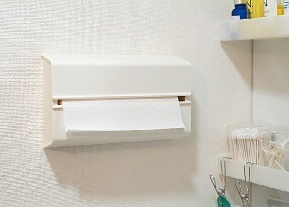ペーパータオルを壁に取り付けて、タオル交換の手間をカット