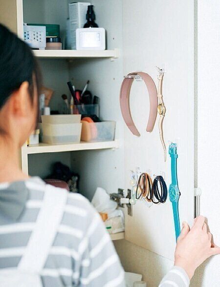 ヘアゴム、カチューシャは洗面台の扉の裏にフックでズラリ!
