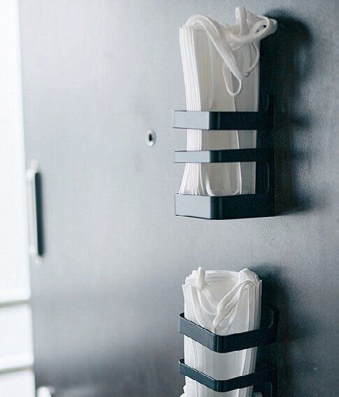 「出がけに『マスクマスク!』となりがちなので、玄関ドアに100円グッズのマグネット式収納を2個つけて置き場を確保。上は中サイズ、下は小サイズと大きさで分けています」。