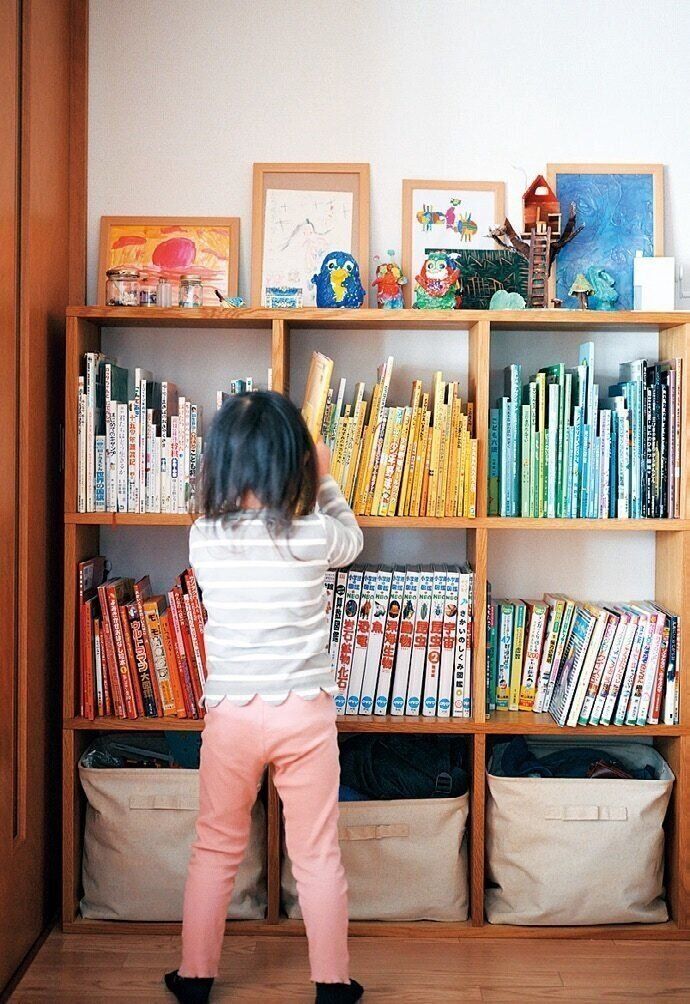 絵本は子ども部屋の棚に色別に収納。「『赤コーナーに戻してね』と言えば2~3歳でもしまう場所がわかります。色別に並べると、本がたくさんあってもスッキリ見えて◎」。