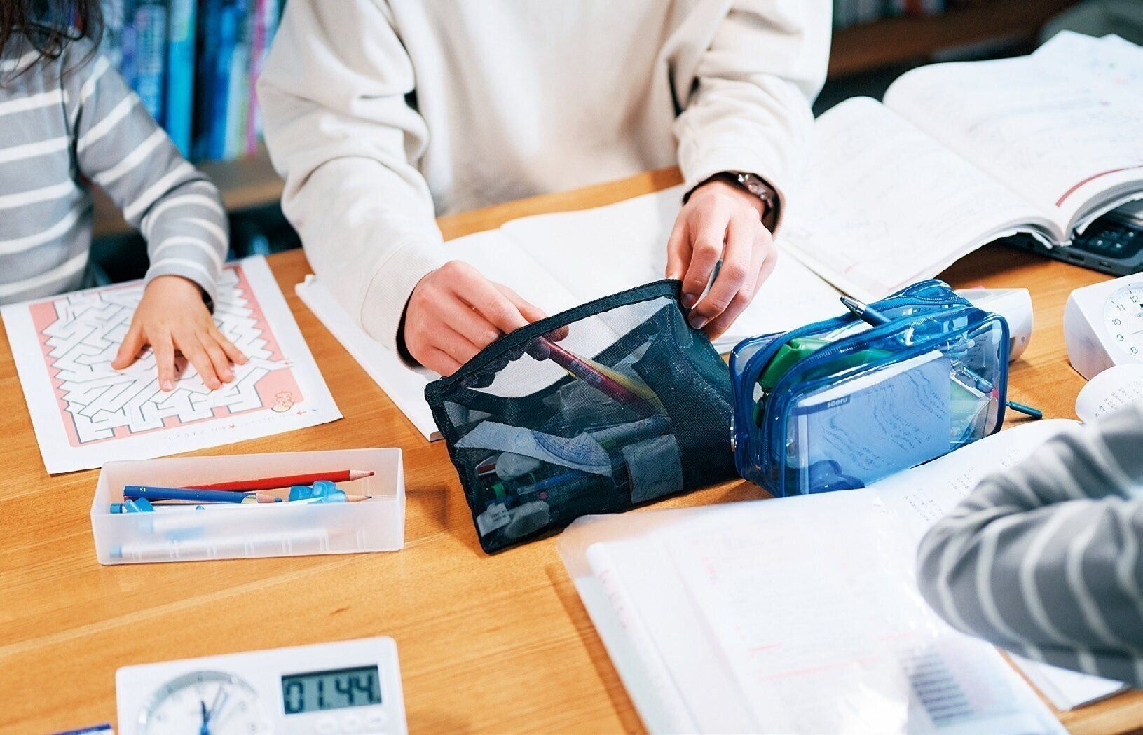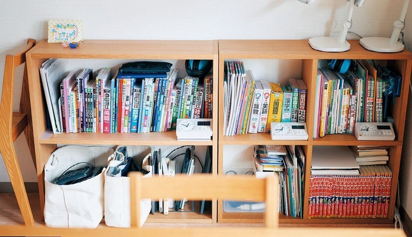 10代の長男と長女は文房具にも好みが出てきたので、家でも自分専用の筆箱を用意。普段はオープン棚の教材の上にポンと収納。好きなグッズを使うと勉強もやる気が出るそう!
