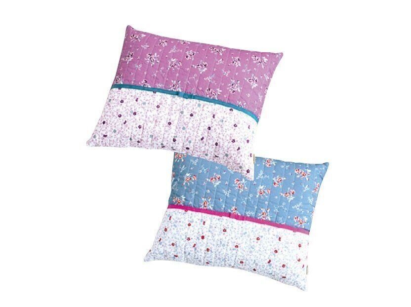 バイカラーのふかふかキルトに、センターのミニリボンがアクセント。裏面はストライプのリバーシブルで、手洗い可能。「ミニクッション ピンク」、「ミニクッション ブルー」(30×40cm)各2,750円