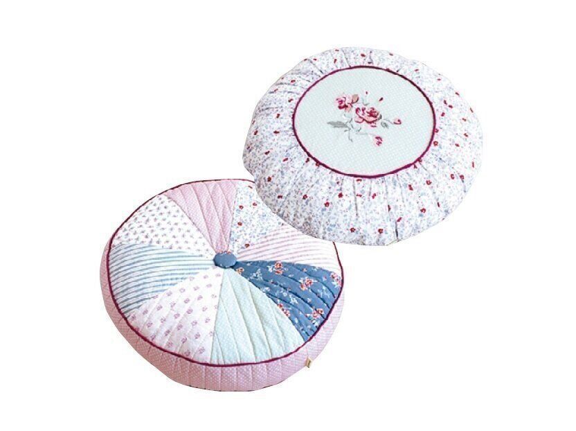 (右)大きな花の刺繍とクシュッとしたギャザーがポイントの「ラウンドクッション 刺繍」、(左)センターにくるみボタンをつけた「ラウンドクッション パッチワーク」。ともに手洗い可能。(直径40cm)各3,960円