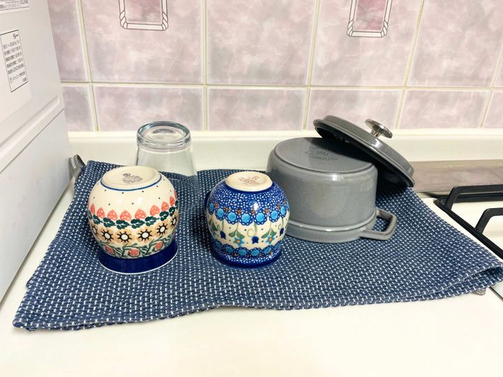 水切りラックをやめて、厚手のキッチンクロスのうえで水を切ることにしたら、手入れも手間なくなりました。