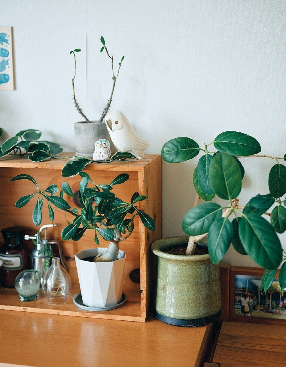 「この小さい木箱の中に置けるサイズの物からグリーンデビューしました。値段的にもお手頃なので失敗しても、あきらめがつくかなと。最初は置き場所をとらない物がオススメです」。