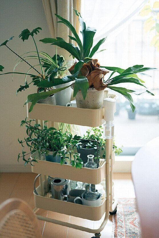 日当たりのいい場所にまとめて移動させることができてラク。上段は上に伸びる物、中段は背の低い物や下に垂れる物、下段にはじょうろなどグリーンケアグッズをIN。