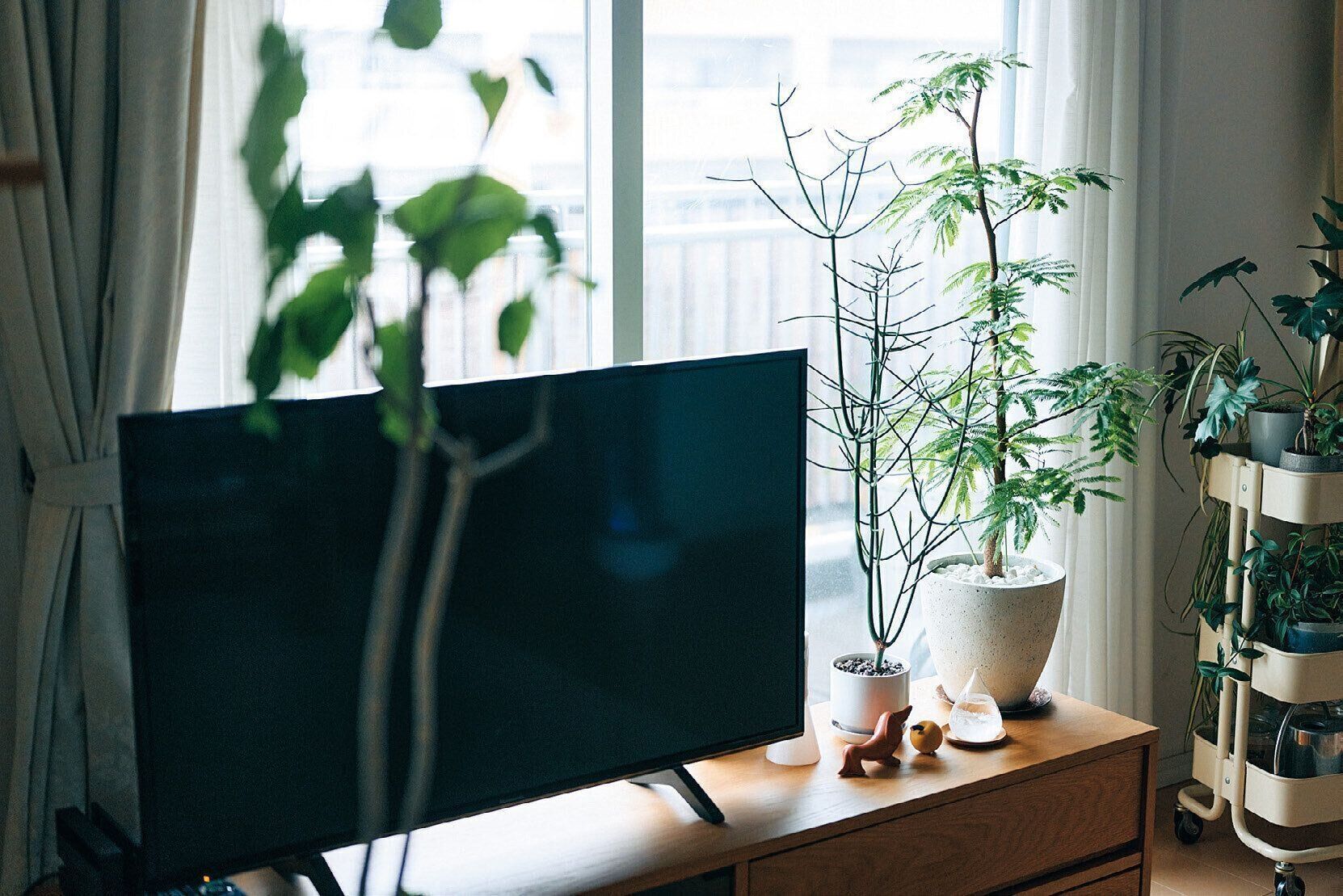 水分不足になると葉の元気がなくなるエバーフレッシュ(テレビ台右の大きな鉢)が目安。変化に気付いたタイミングで水やり。