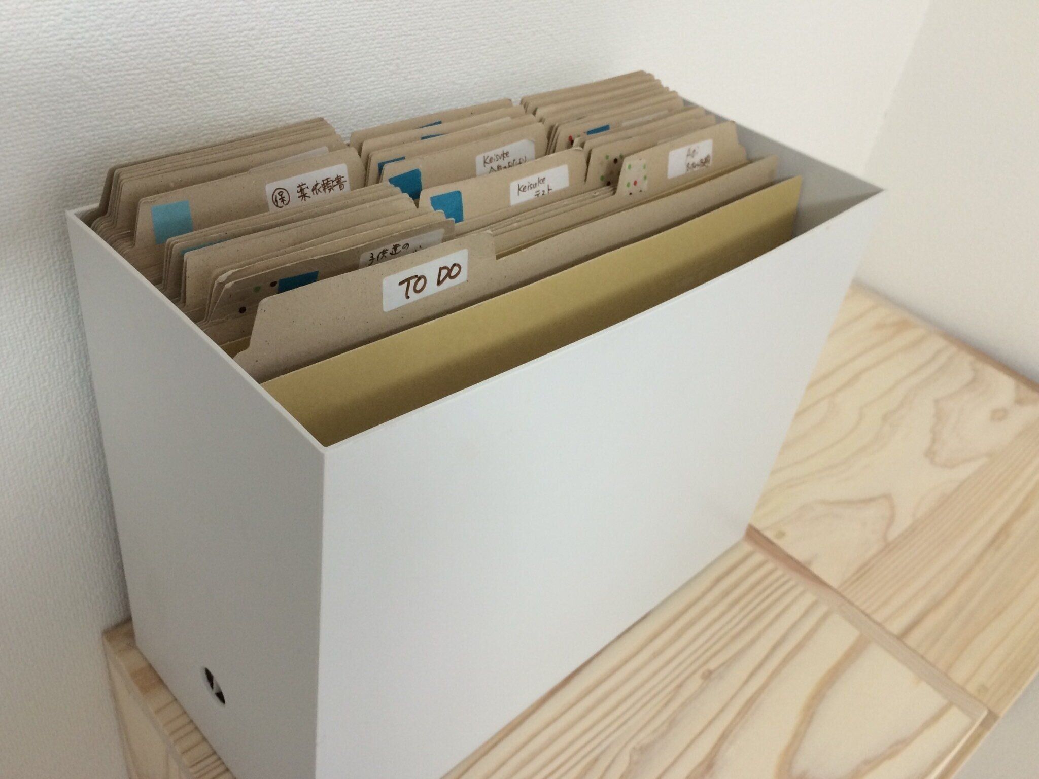 ボックス内に書類が増え、個別フォルダが引き出しにくくなったら整理のサイン。「todo」の書類の処理すればよく、必要な時に必要なモノがパッと引き出せて便利です。