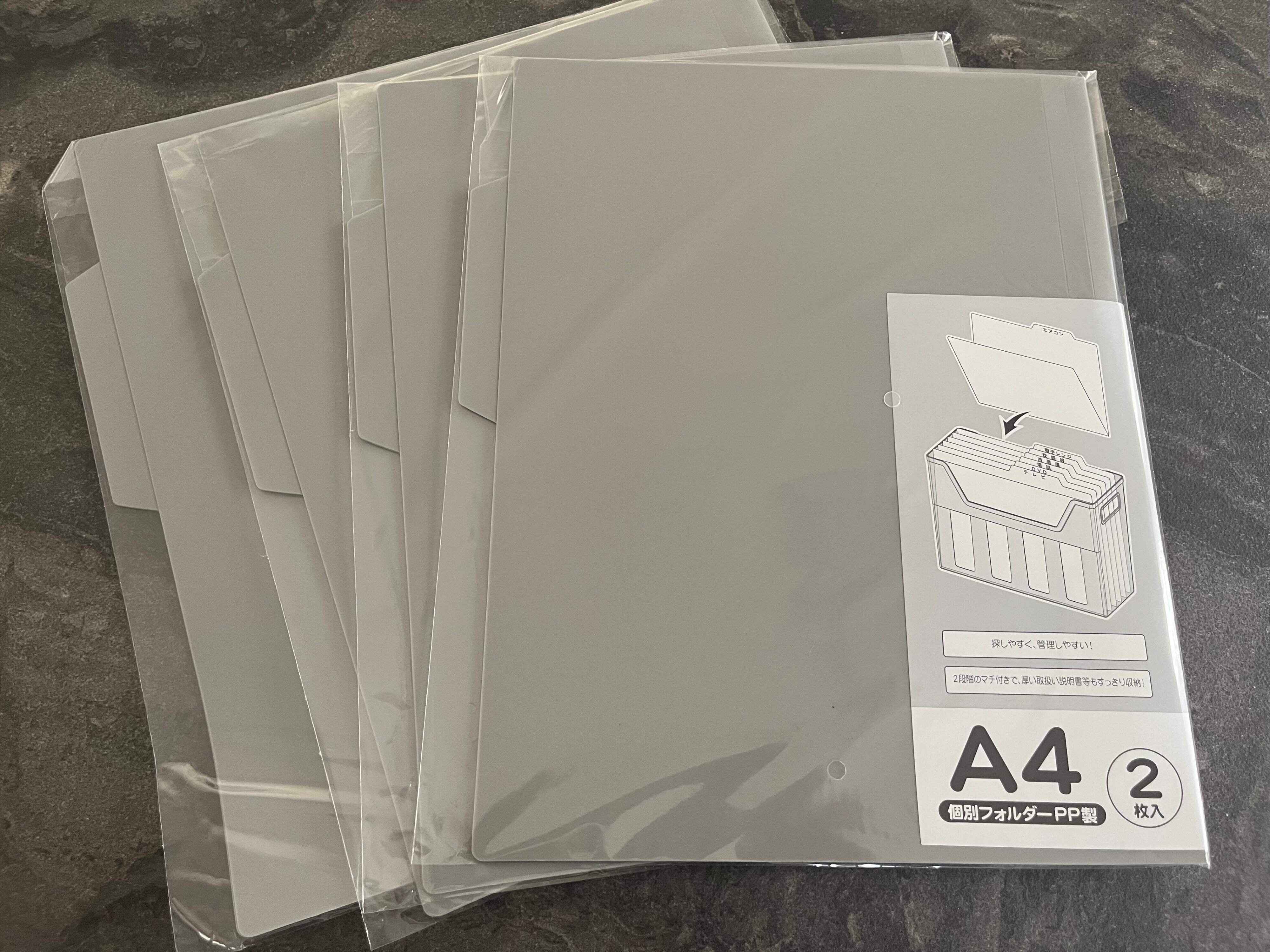 筆者が利用しているのはセリアの「A4個別フォルダpp製」。2枚入りで110円です。