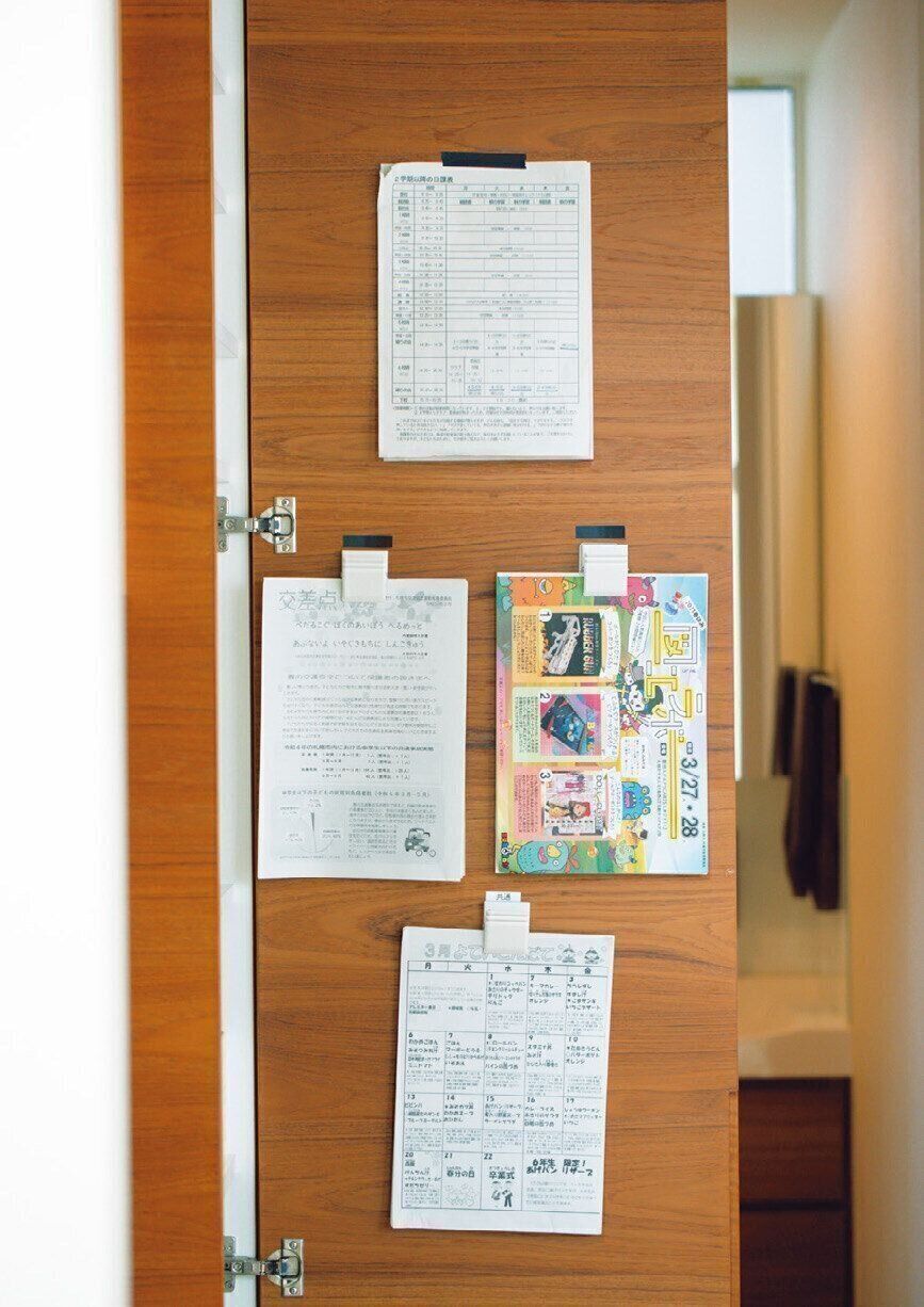 学校から持ち帰るプリント類は、兄弟別、内容別にマグネットクリップで挟んで扉裏の定位置へ。ファイルに入れる手間も不要で、扉を閉めれば一瞬ですっきり!