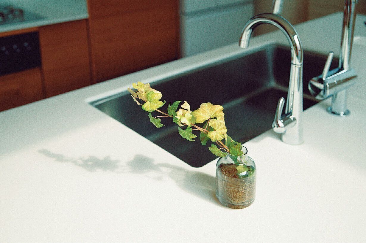 物が多かった頃は心に余裕がなくて「植物を枯らす名人」でした。でも物を減らしたら、シンク横に植物を飾って眺める余裕が生まれ、水を換える時間も癒やしのひとときに。