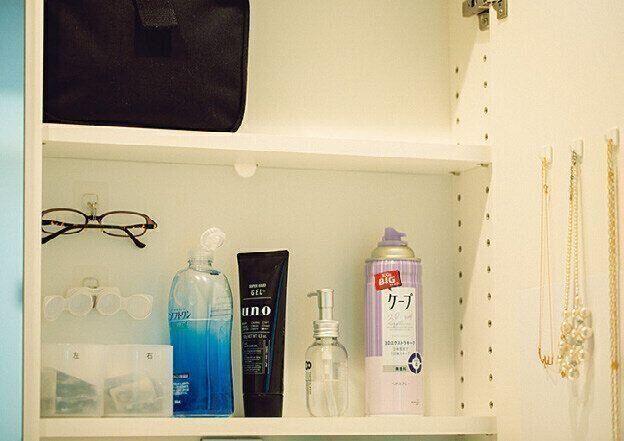 扉を開けたら中の物をすぐに使いたいから、基本フタは開けっぱなし。ビッグサイズのケープはここでしか使わないからフタは処分。洗面鏡の扉自体がフタと考えればよし!
