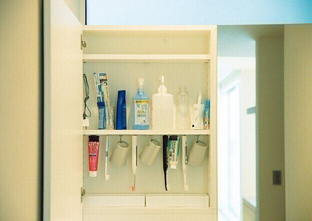 電動歯ブラシは立てるより逆さに吊るしたほうが汚れと水気がたまらない。歯ブラシの下にはペーパーを敷いたケースを置いて水気をキャッチ。コップと歯磨き粉も吊るして。
