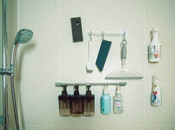 入浴の最後に掃除をするのが習慣だから、洗剤も掃除道具も浴室内に吊るす収納に。「目に入る位置に掃除グッズが全部並んでいるので、勝手に体が動いてお掃除完了です」。